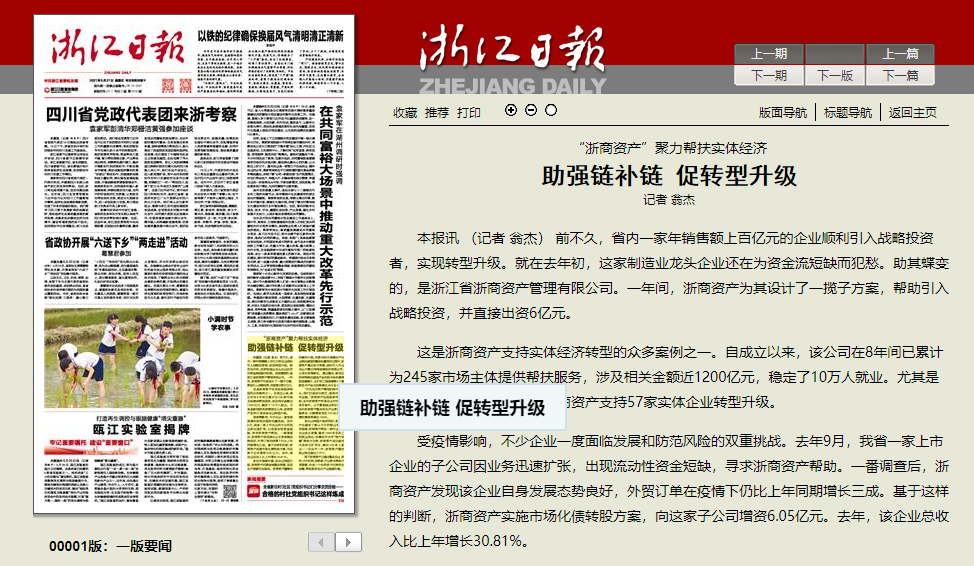 【浙江日報頭版】助強鏈補鏈 促轉(zhuǎn)型升級 | “浙商資產(chǎn)”聚力幫扶實體經(jīng)濟