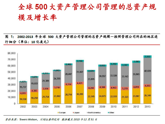 1.關(guān)于全球500 大資產(chǎn)管理公司:1)截至2013 年年底,全球500 大產(chǎn)管理公司管理的總資產(chǎn)規(guī)模達(dá)到76.5萬億美元,同比增長12.0%,首超過危機(jī)之前的2007 年的水平;2)其中北美地區(qū)的資產(chǎn)管理公司的規(guī)模是42 萬億美元,同比增長17.0%;歐洲為26.3 萬億美元,同比長9.8;日本為4.6 萬億美元,同比減少5.5%;3)超過6 成的資產(chǎn)由全球前500大資產(chǎn)管理公司管理。